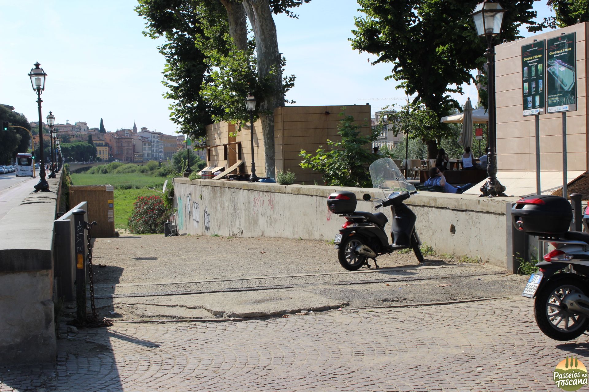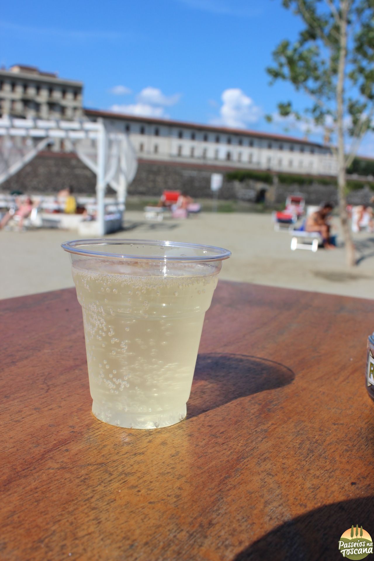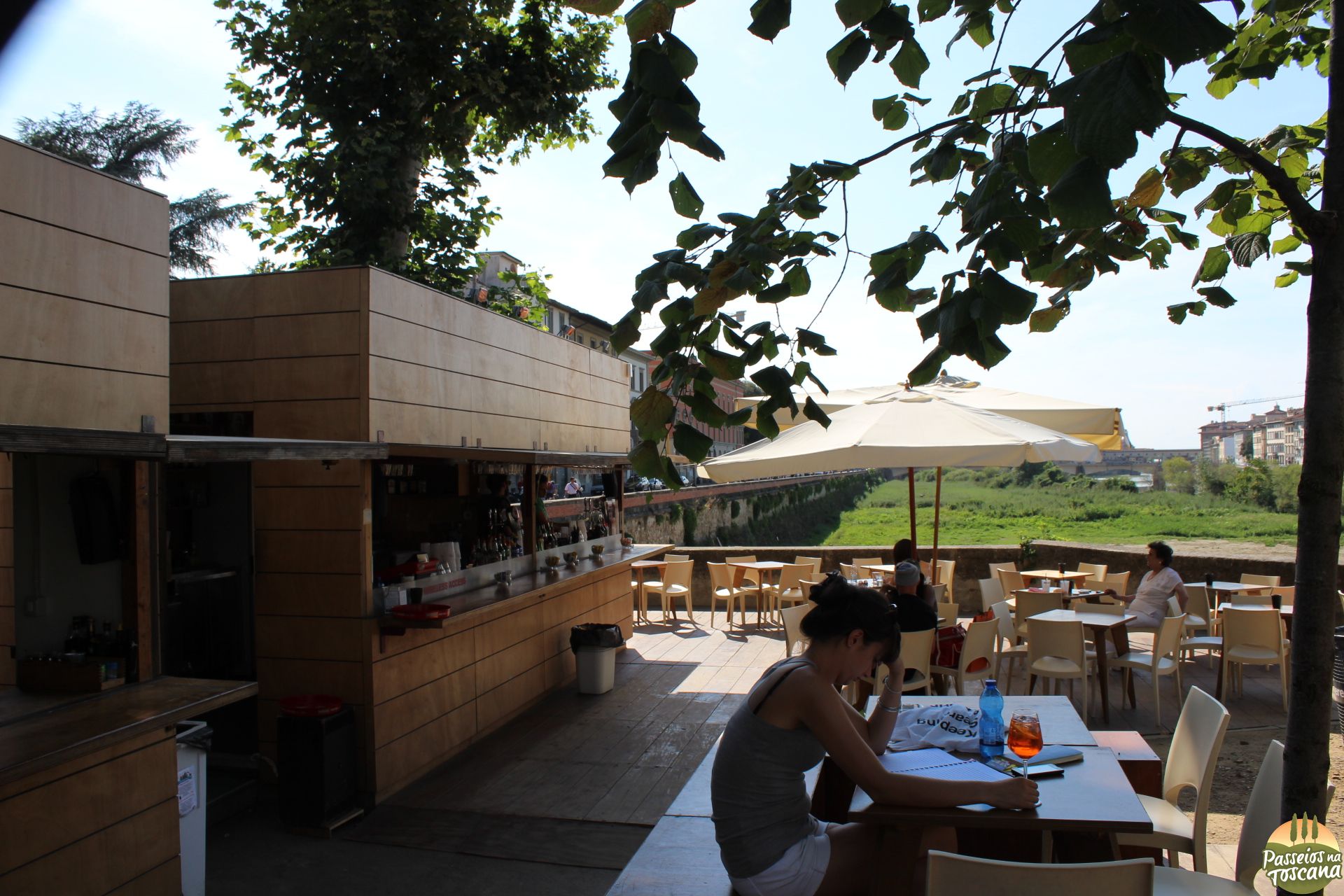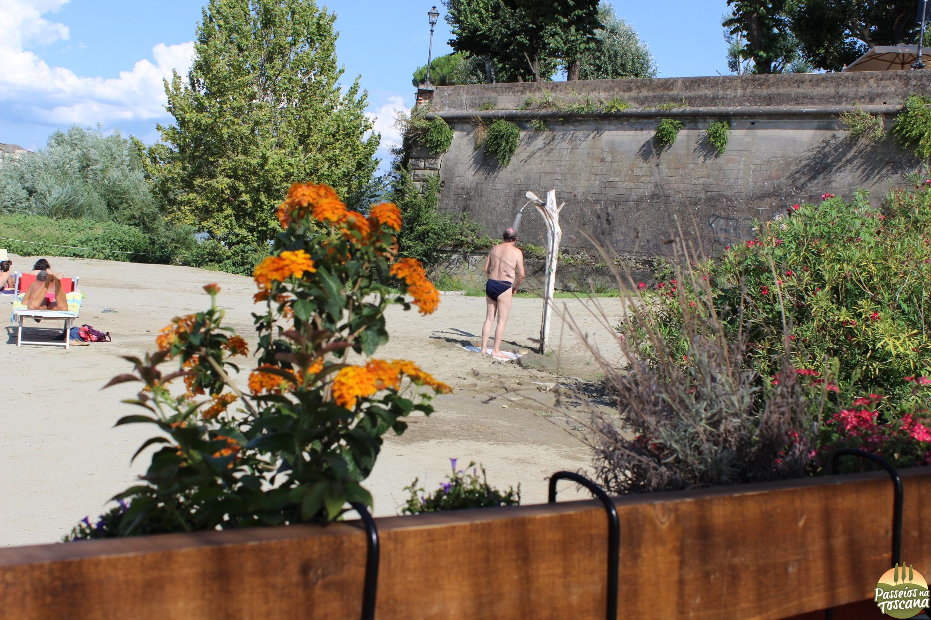 Imagina que assim que o verão inicia, os italianos vão correndo pegar um bronzeado, mas nem sempre tem a possibilidade de ir ao mar, nos fins de semana se formam congestionamentos em direção ao mar na saída de Florença e tem gente que prefere pegar uma “corzinha” sem sair da cidade. E a alguns anos a prefeitura cedeu o espaço próximo ao rio Arno, colocando sempre areia, para a gestão de uma Associação que organiza o bar, as espreguiçadeiras e atividades noturnas.