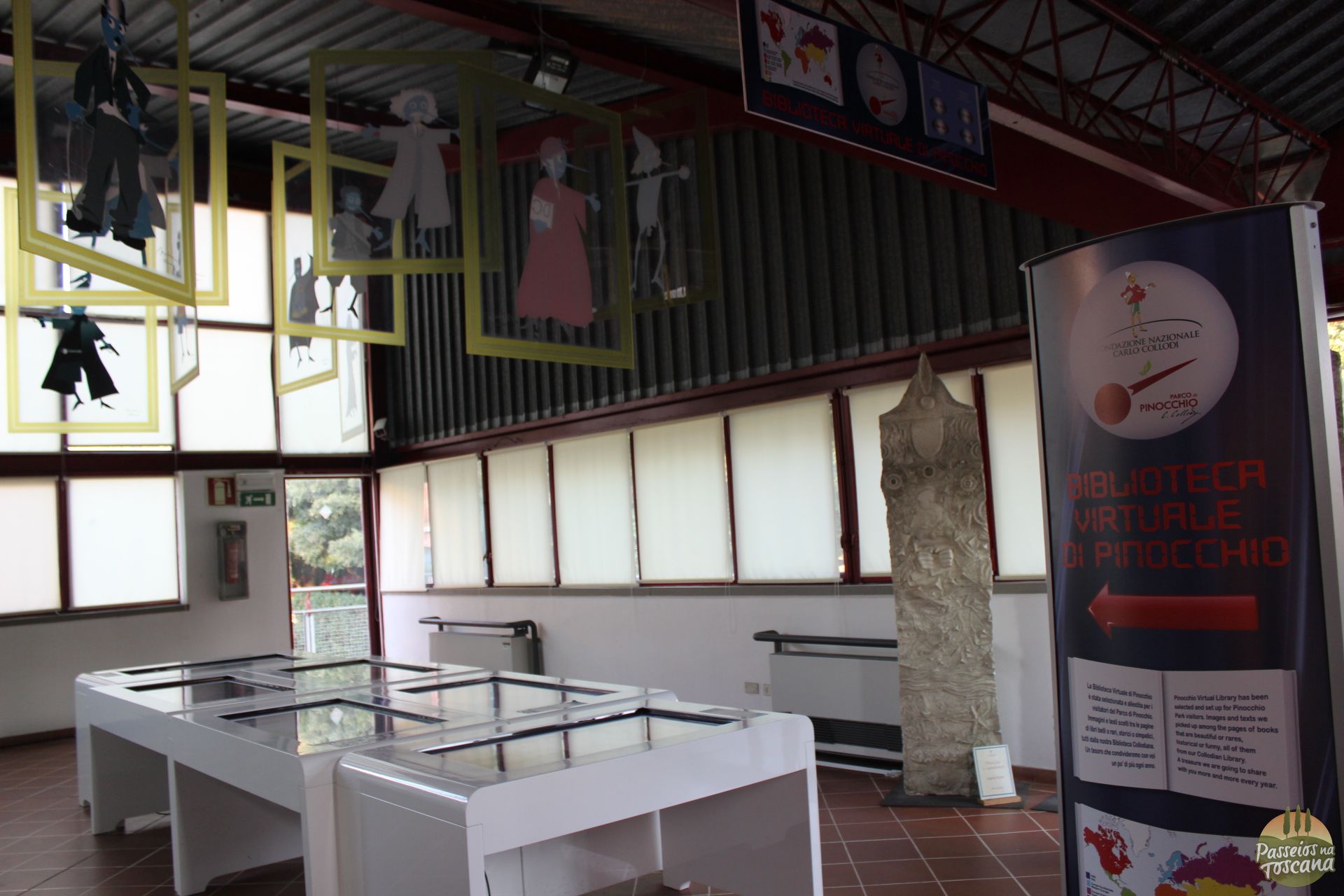 Ainda uma Biblioteca virtual sobre Pinocchio, onde há telas de touch screen para crianças e adultos poderem conhecerem os vários desenhos e obras de arte.