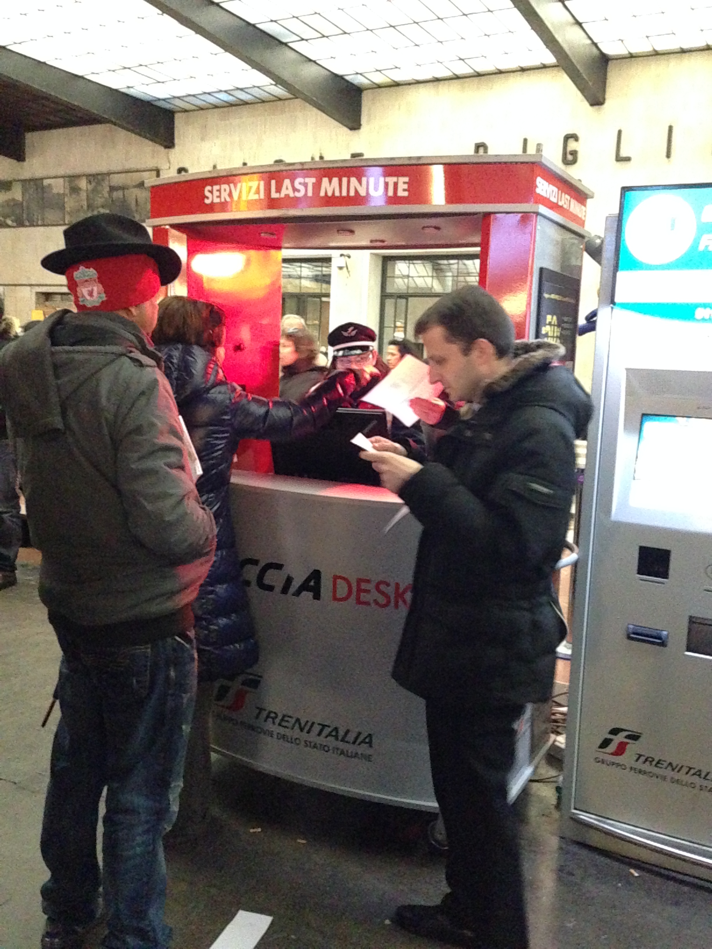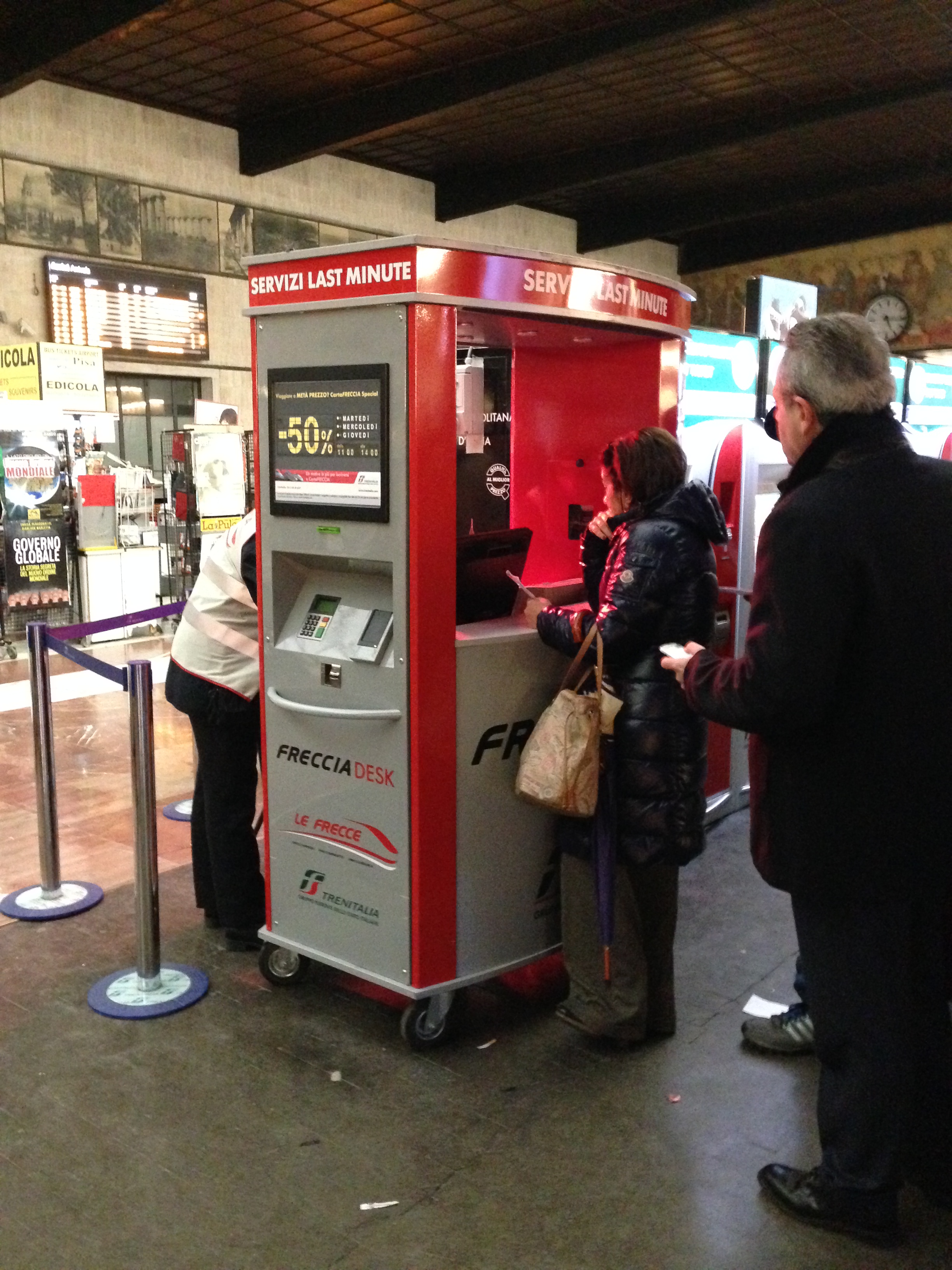 Se for viajar de Freccia, os trens rápidos, na estação de Santa Maria Novella há uma bilheteria especial no meio da estação, próximo aos trens, e ela é móvel, veja exemplos:
