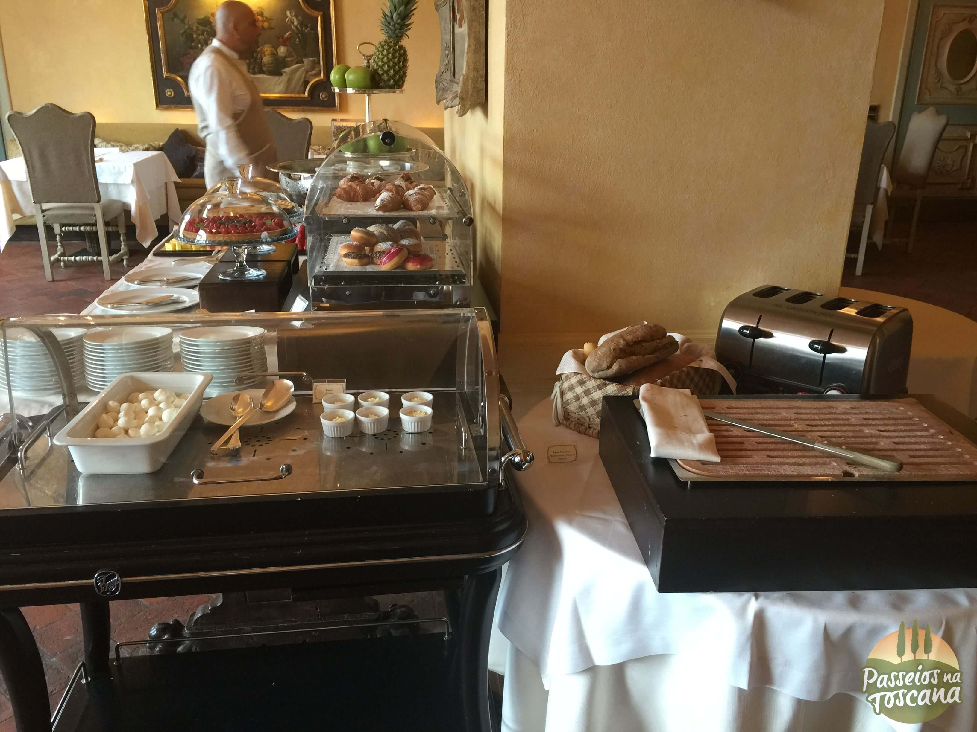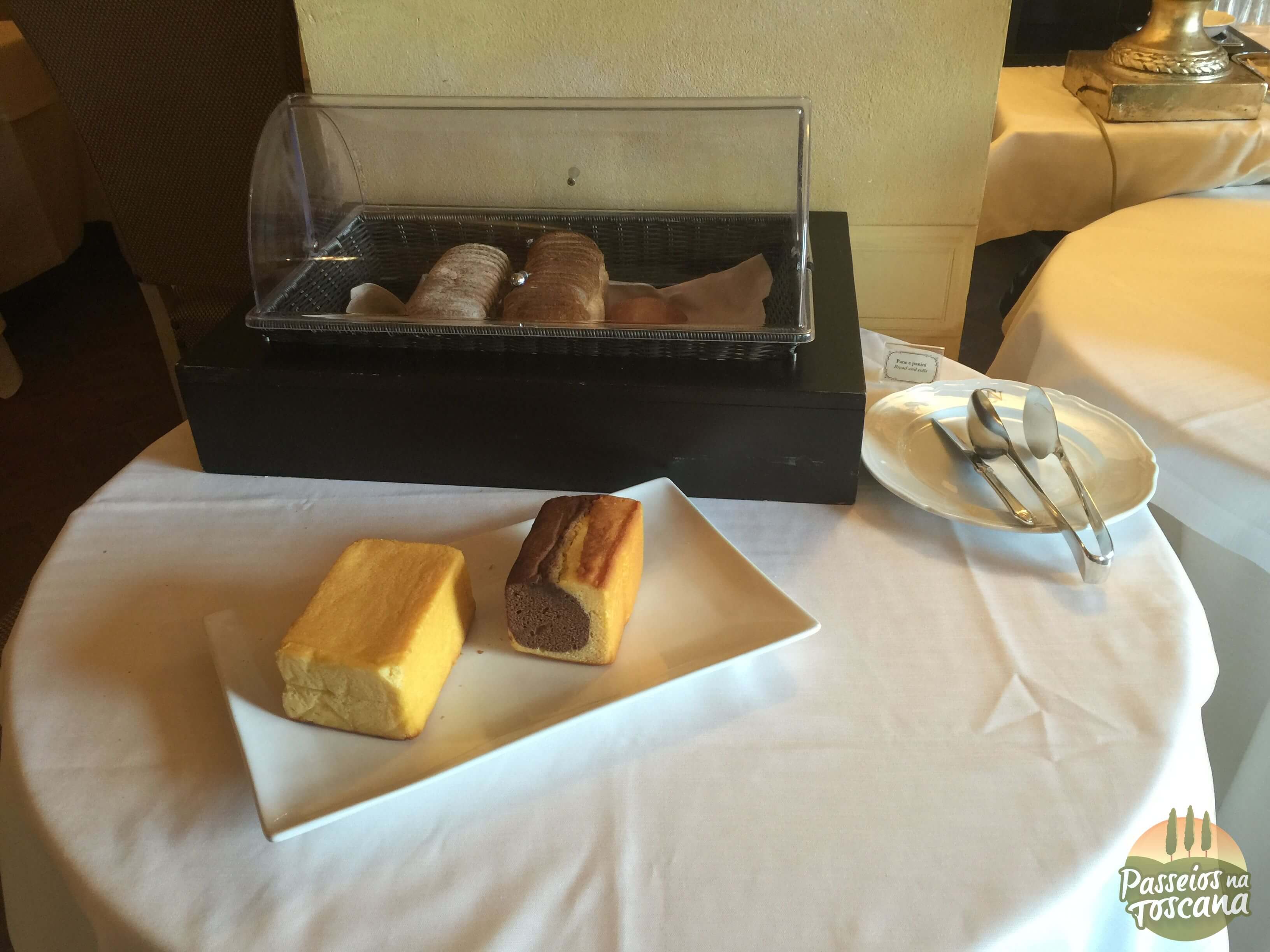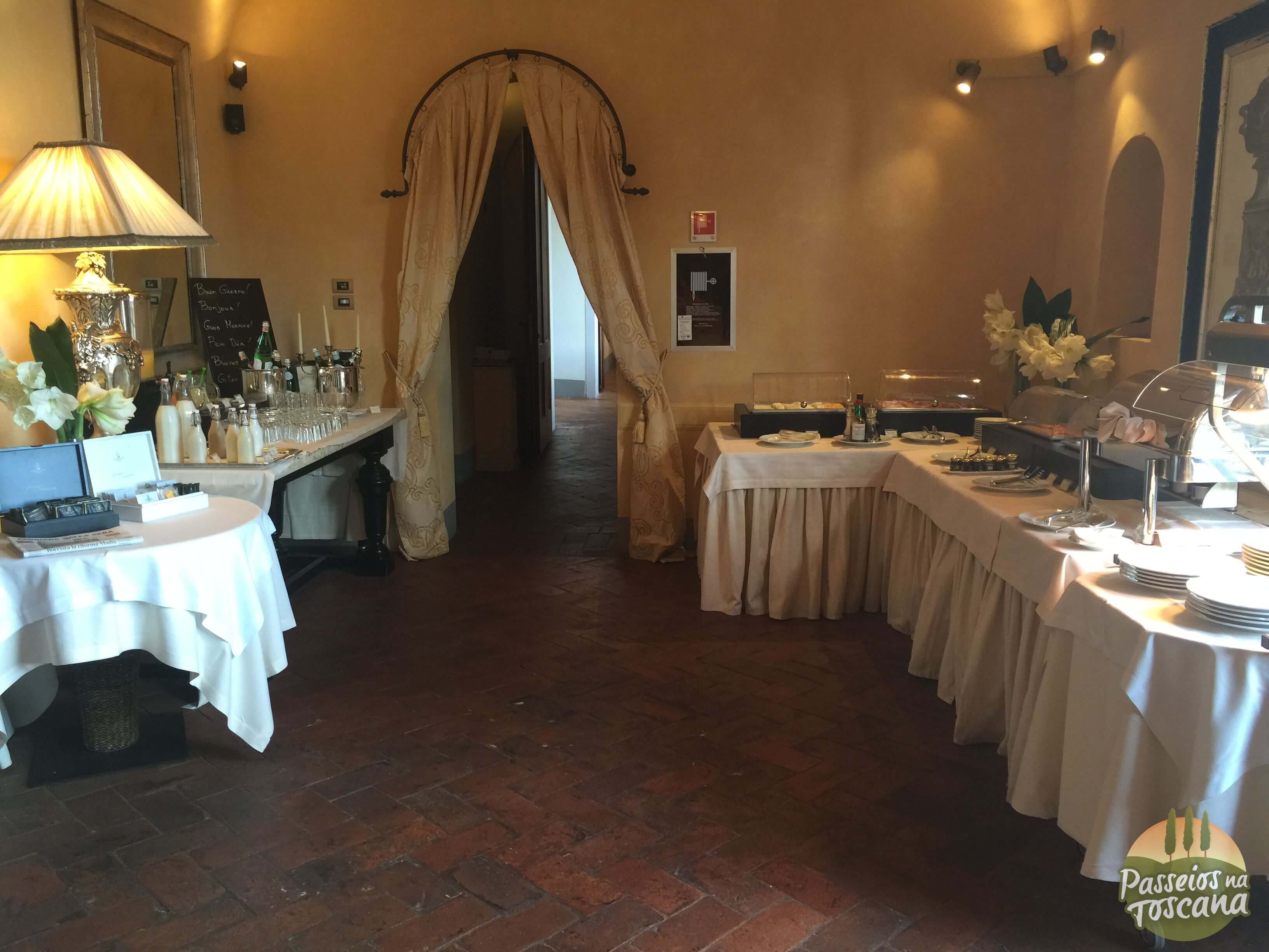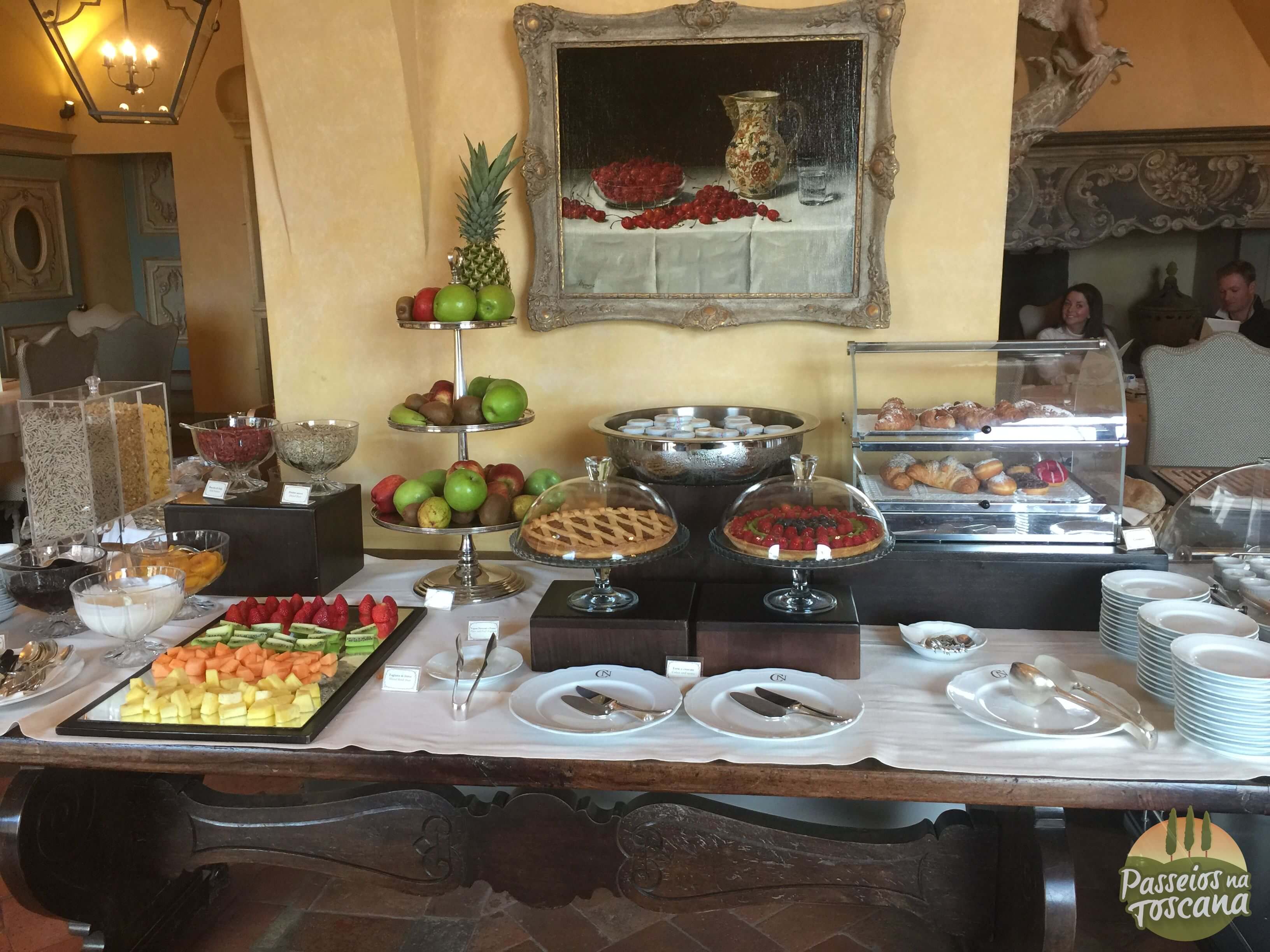 O café da manhã foi dentro da área do restaurante La Torre, porque era inverno. No verão ele acontece nas áreas externas do Castelo, por isso coloco algumas fotos cedidas pelo hotel.