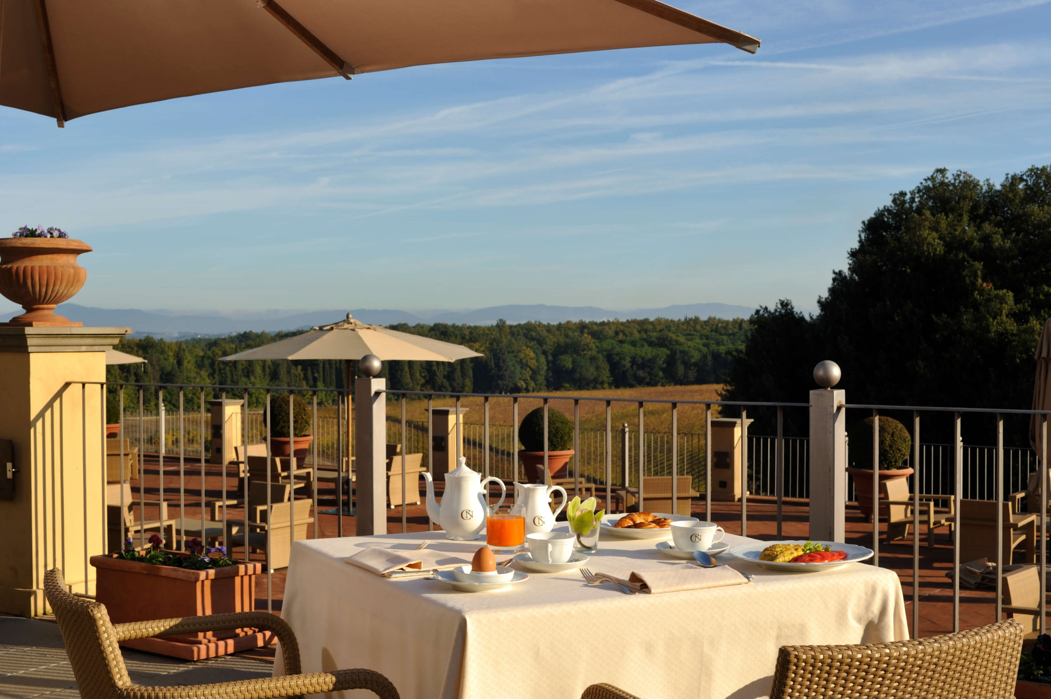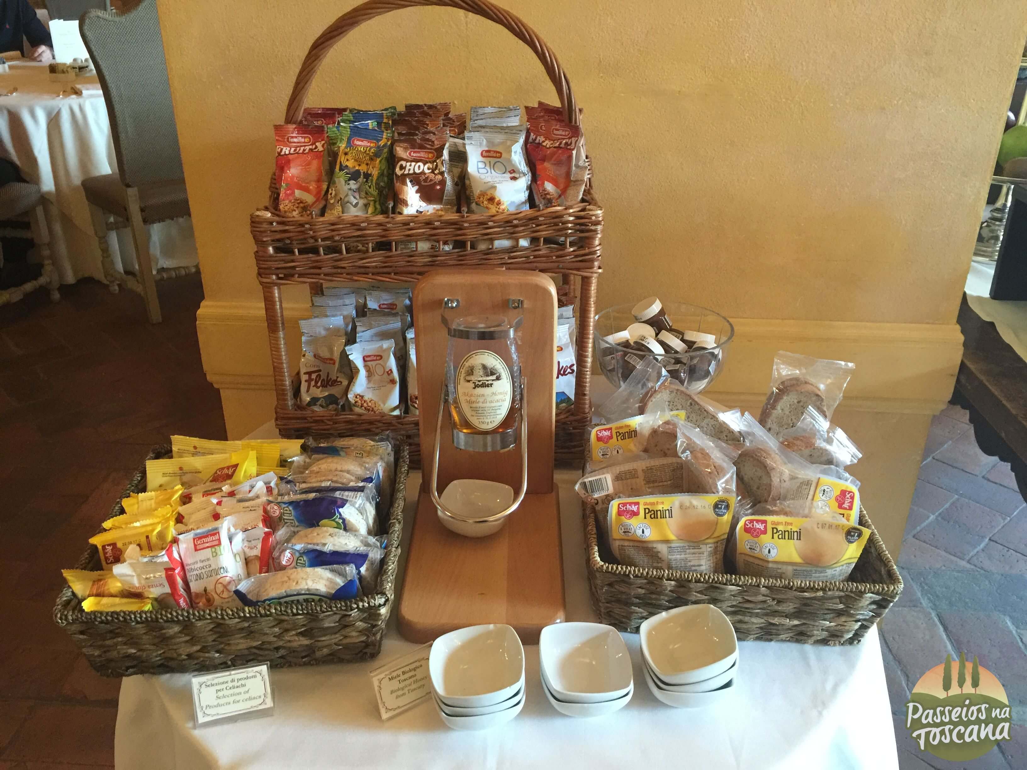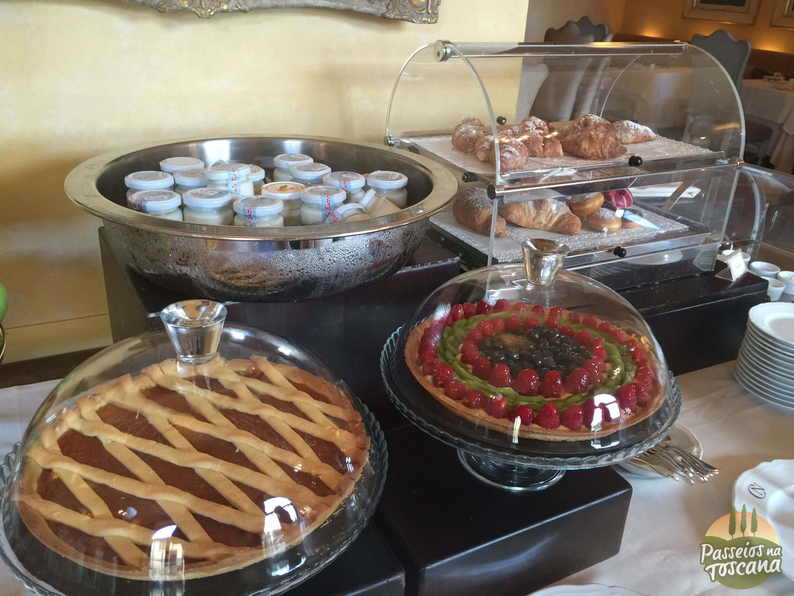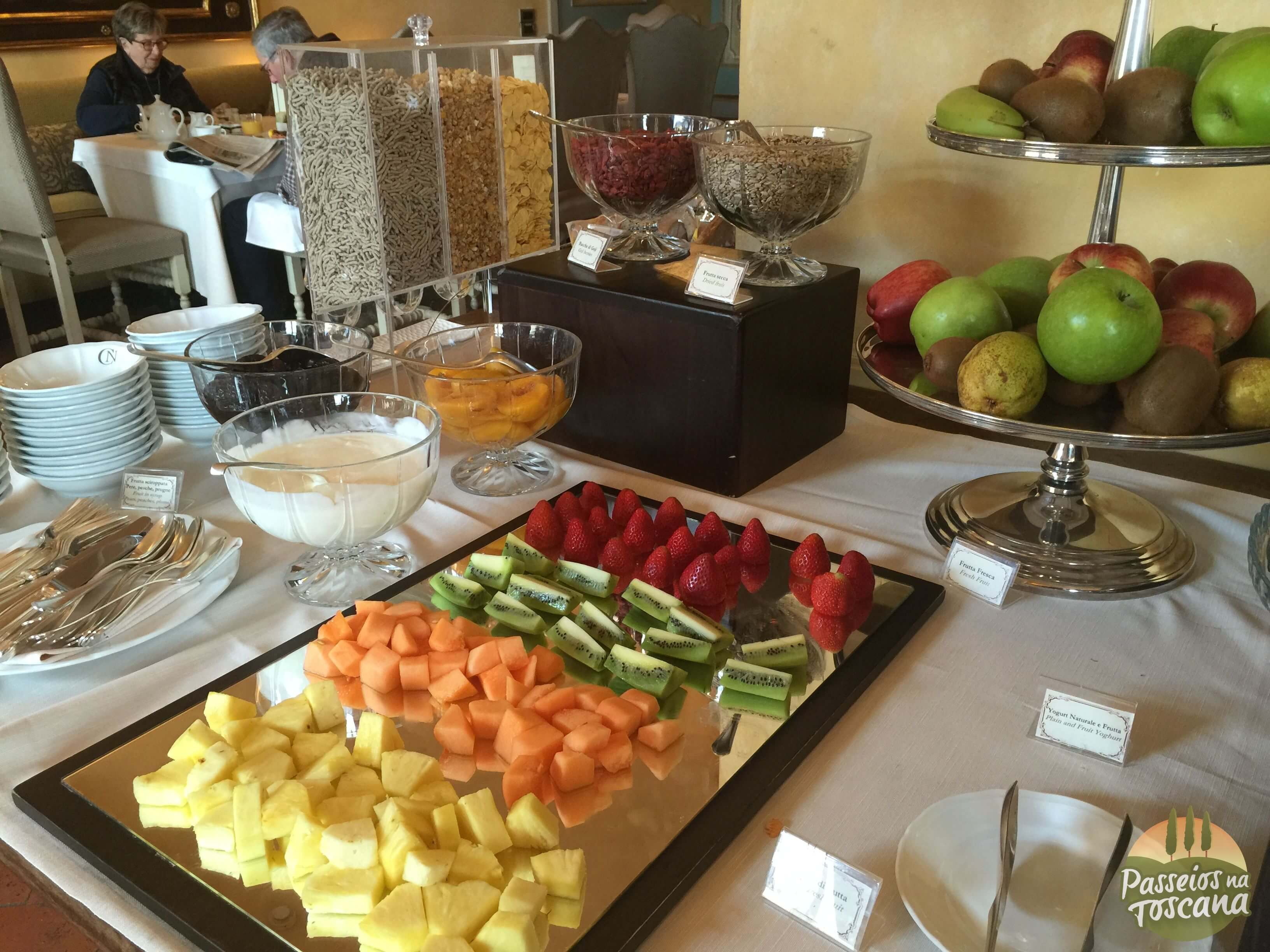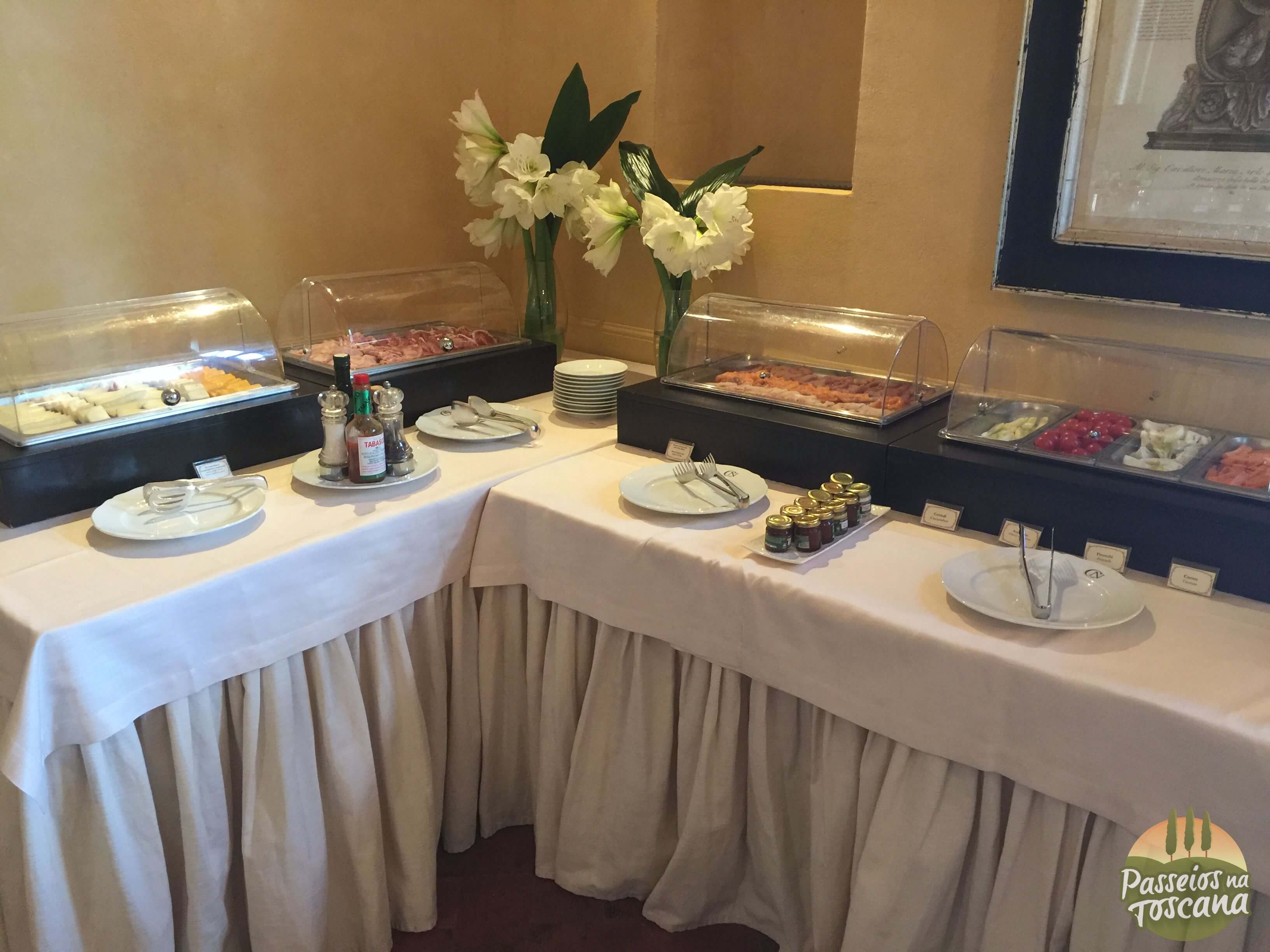 O café da manhã foi dentro da área do restaurante La Torre, porque era inverno. No verão ele acontece nas áreas externas do Castelo, por isso coloco algumas fotos cedidas pelo hotel.