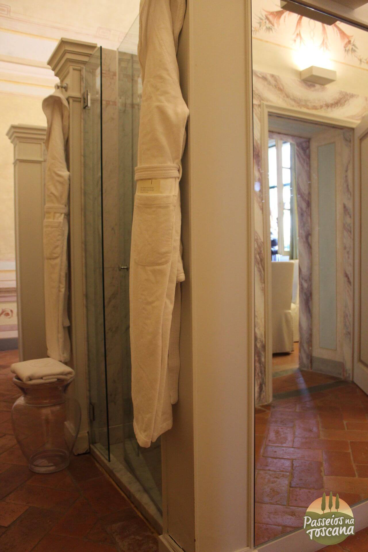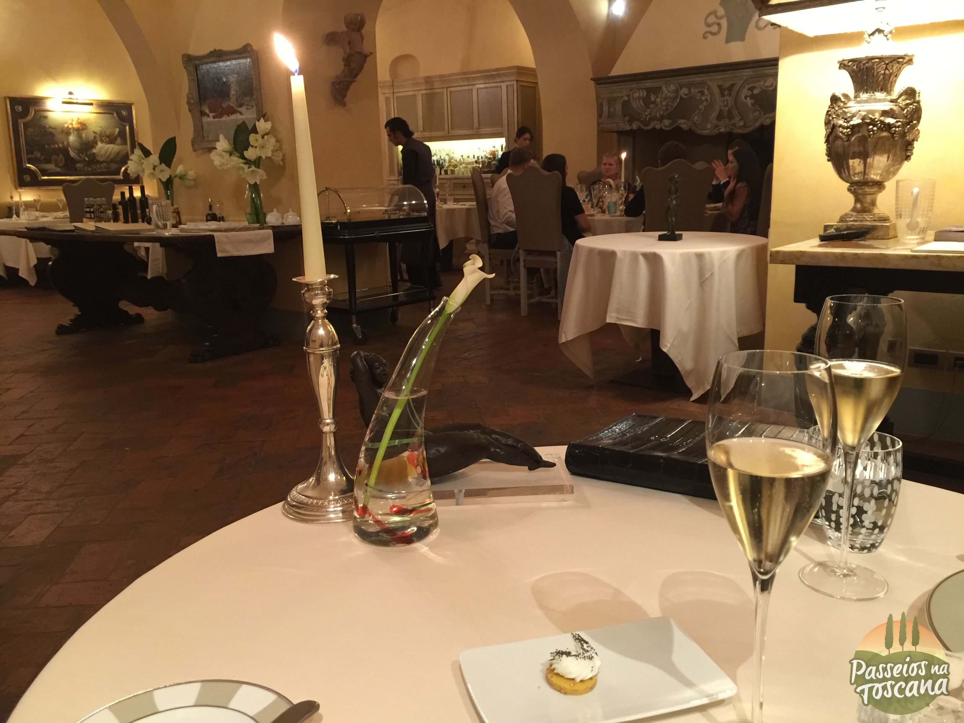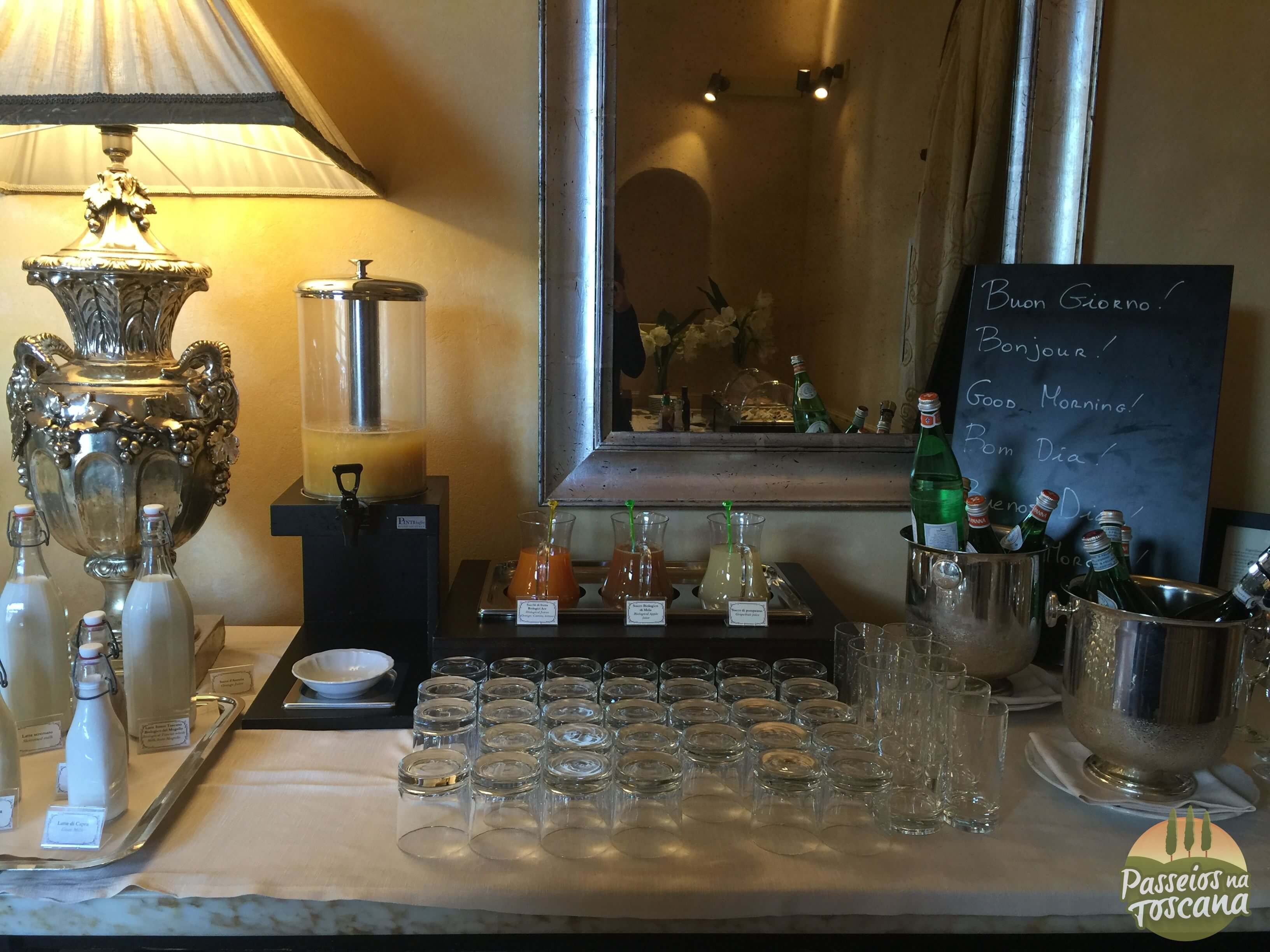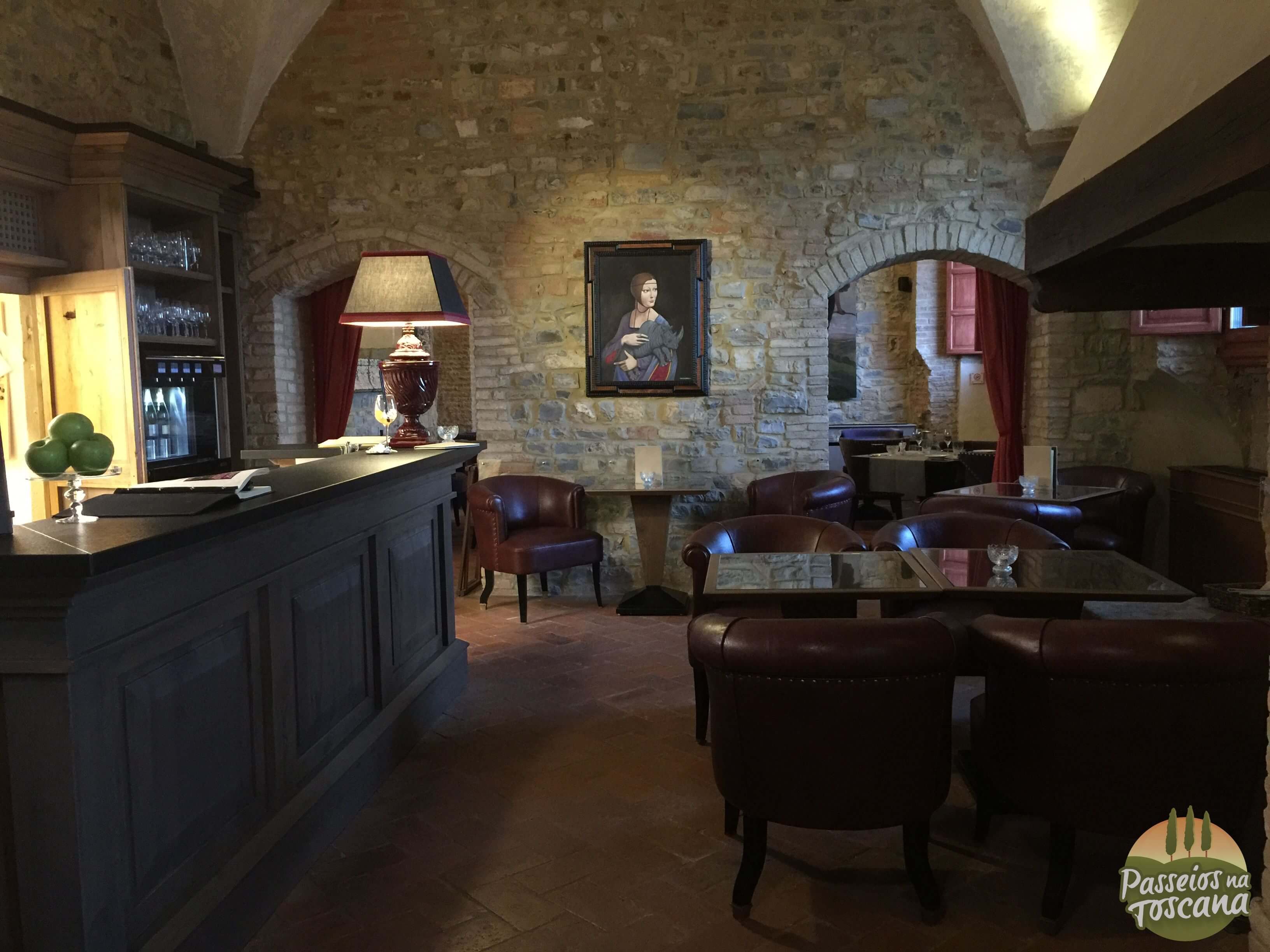 Vamos por partes. O hotel tem uma Enoteca maravilhosa, com centenas de garrafas, onde o sommelier organiza degustações de vinhos que contam a história do Brunello di Montalcino, dos produtores de Chianti Classico ou dos famosos e prestigiados Super Toscanos, com tábua de frios e queijos combinados com vinhos. A lista de vinhos é citada pela Wine Spectator.
