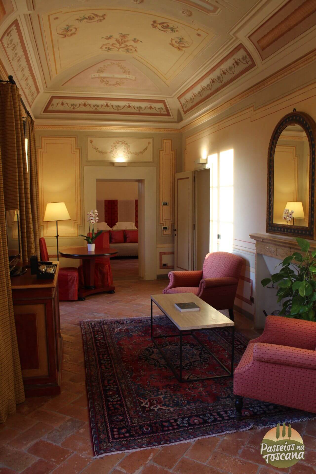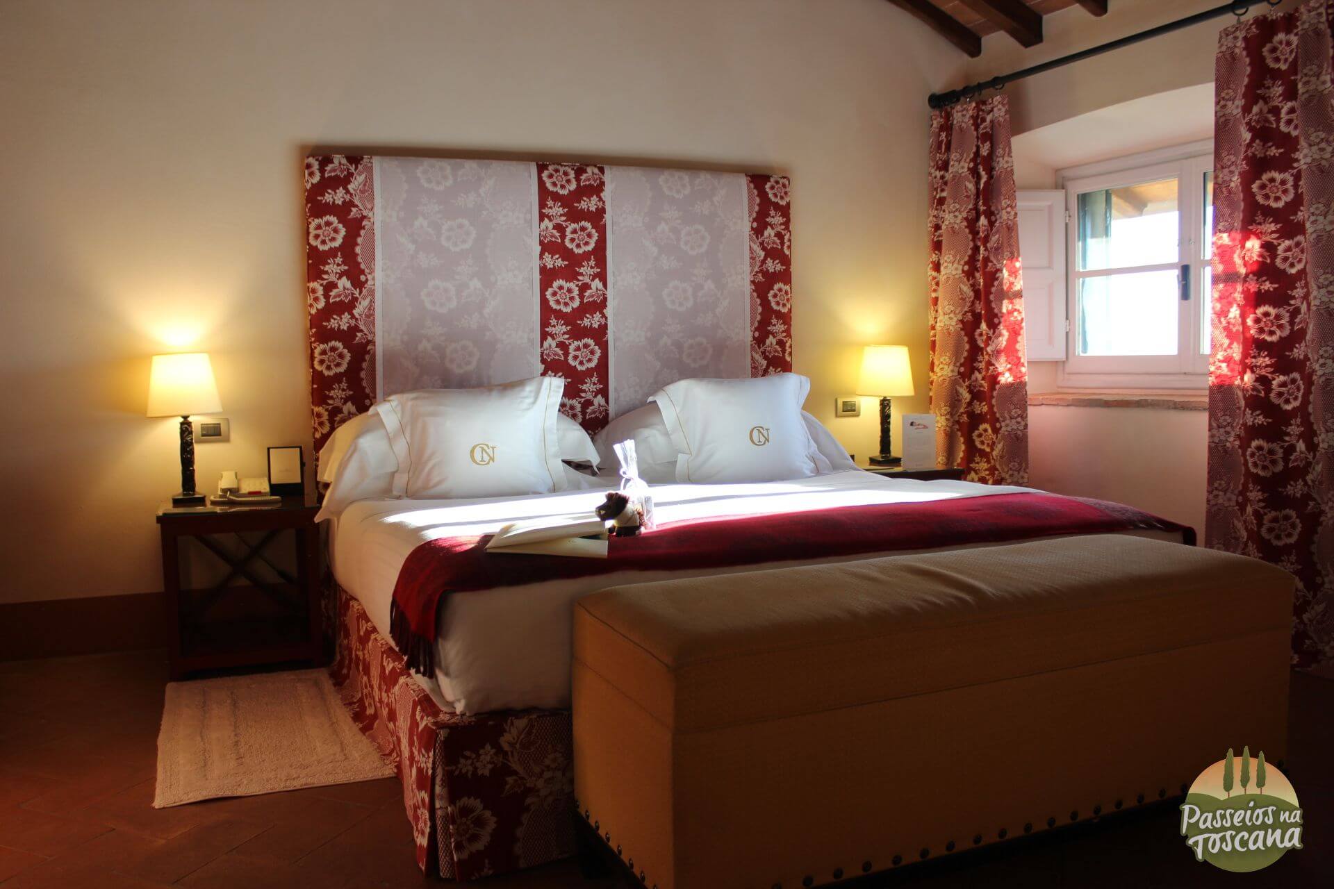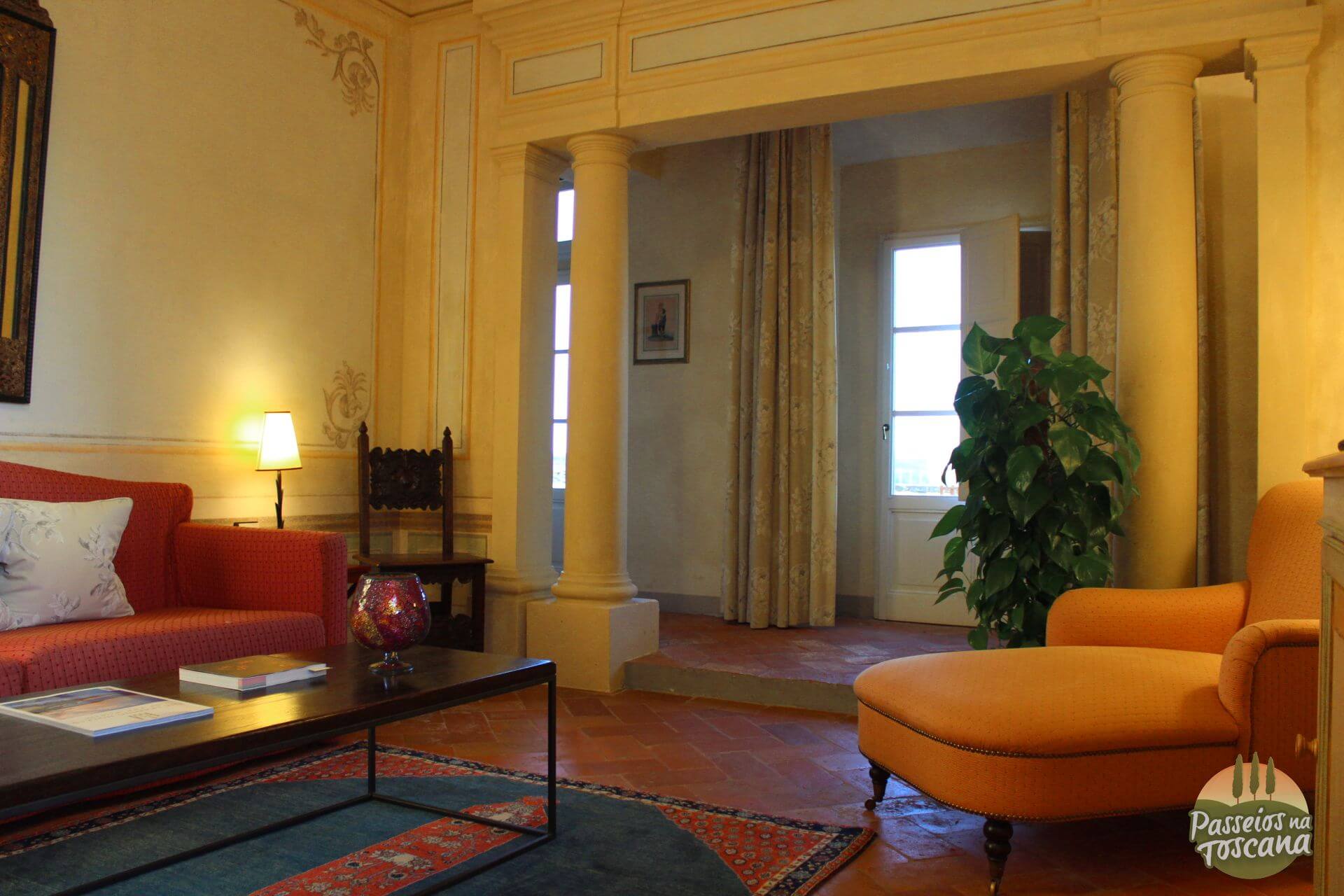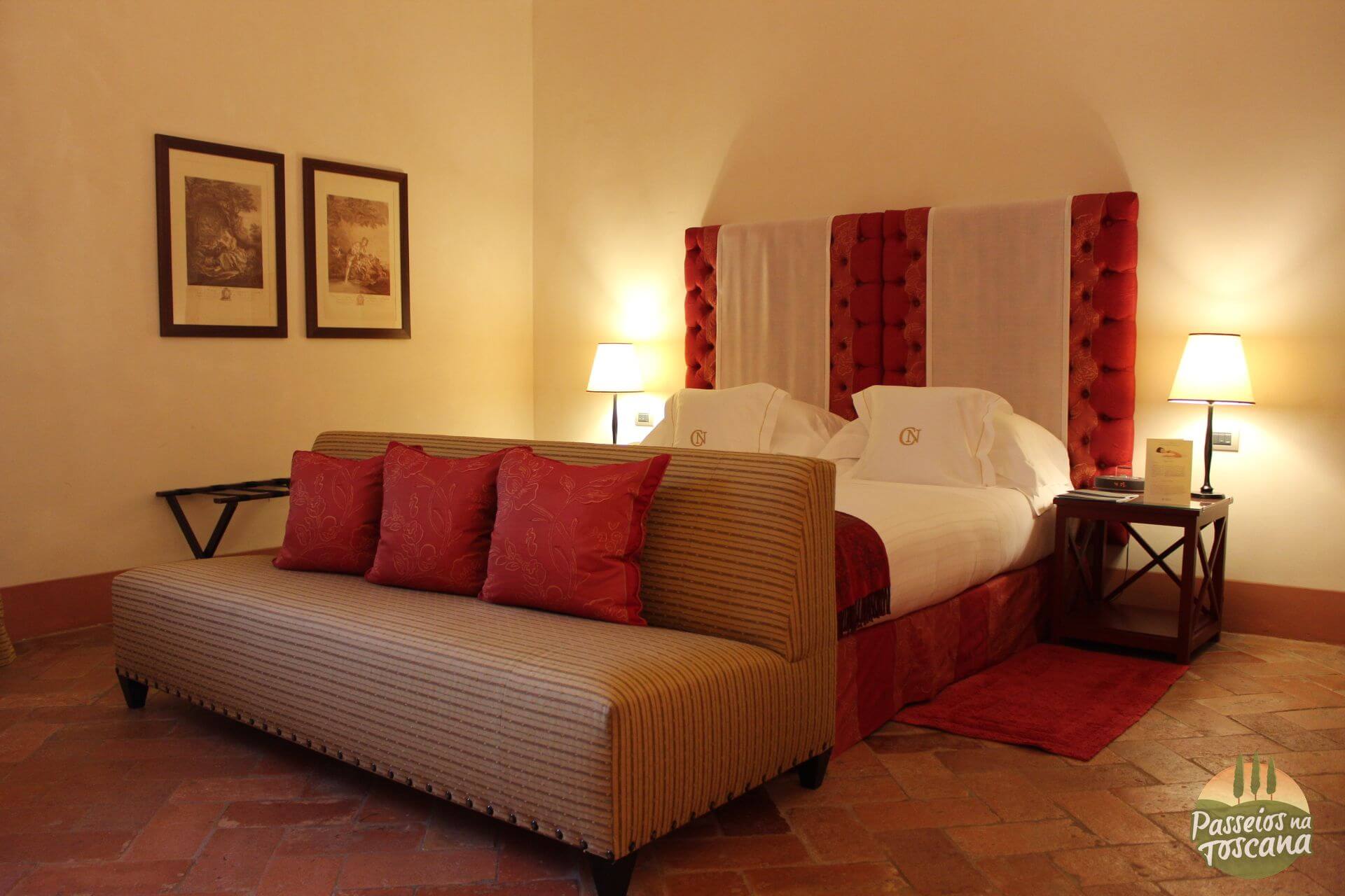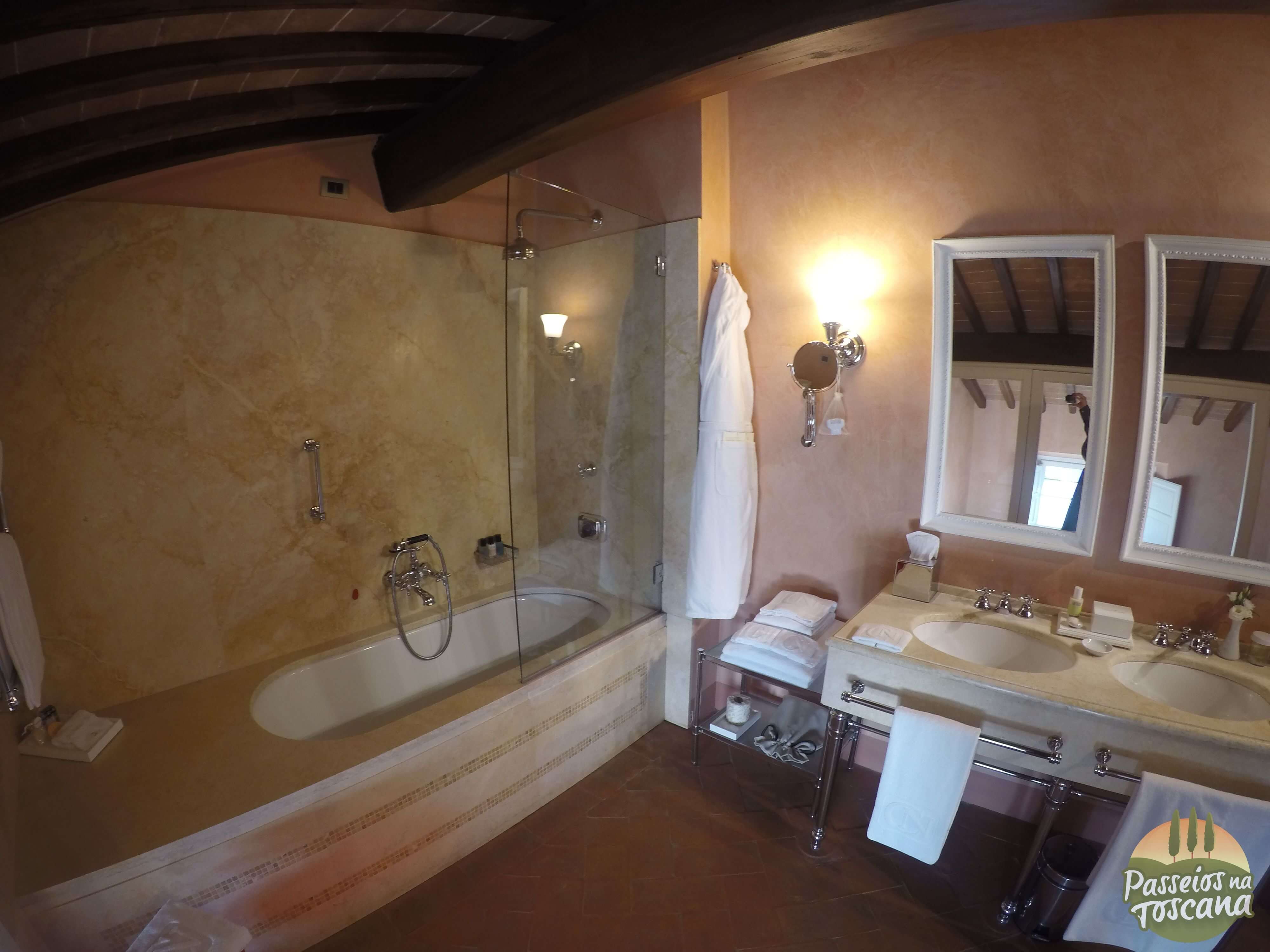 Vamos por partes. O hotel tem uma Enoteca maravilhosa, com centenas de garrafas, onde o sommelier organiza degustações de vinhos que contam a história do Brunello di Montalcino, dos produtores de Chianti Classico ou dos famosos e prestigiados Super Toscanos, com tábua de frios e queijos combinados com vinhos. A lista de vinhos é citada pela Wine Spectator.