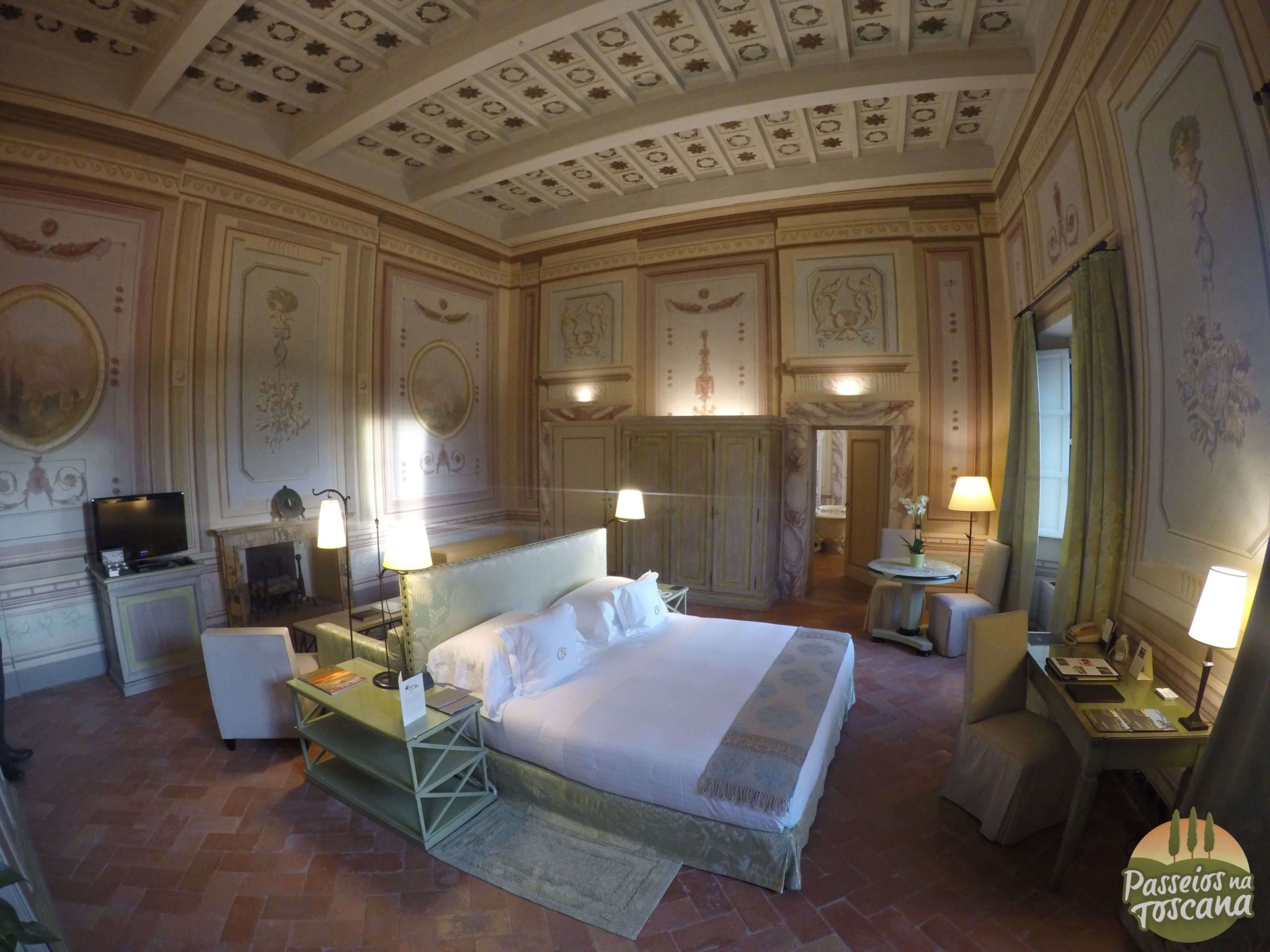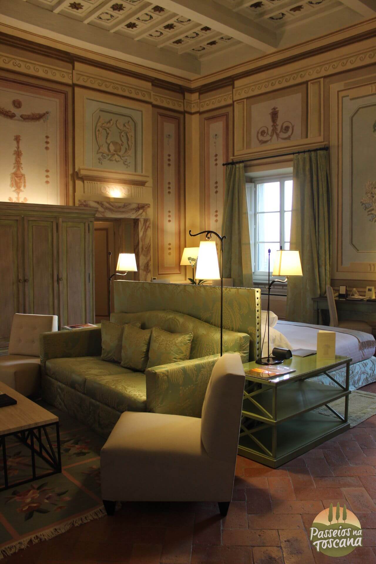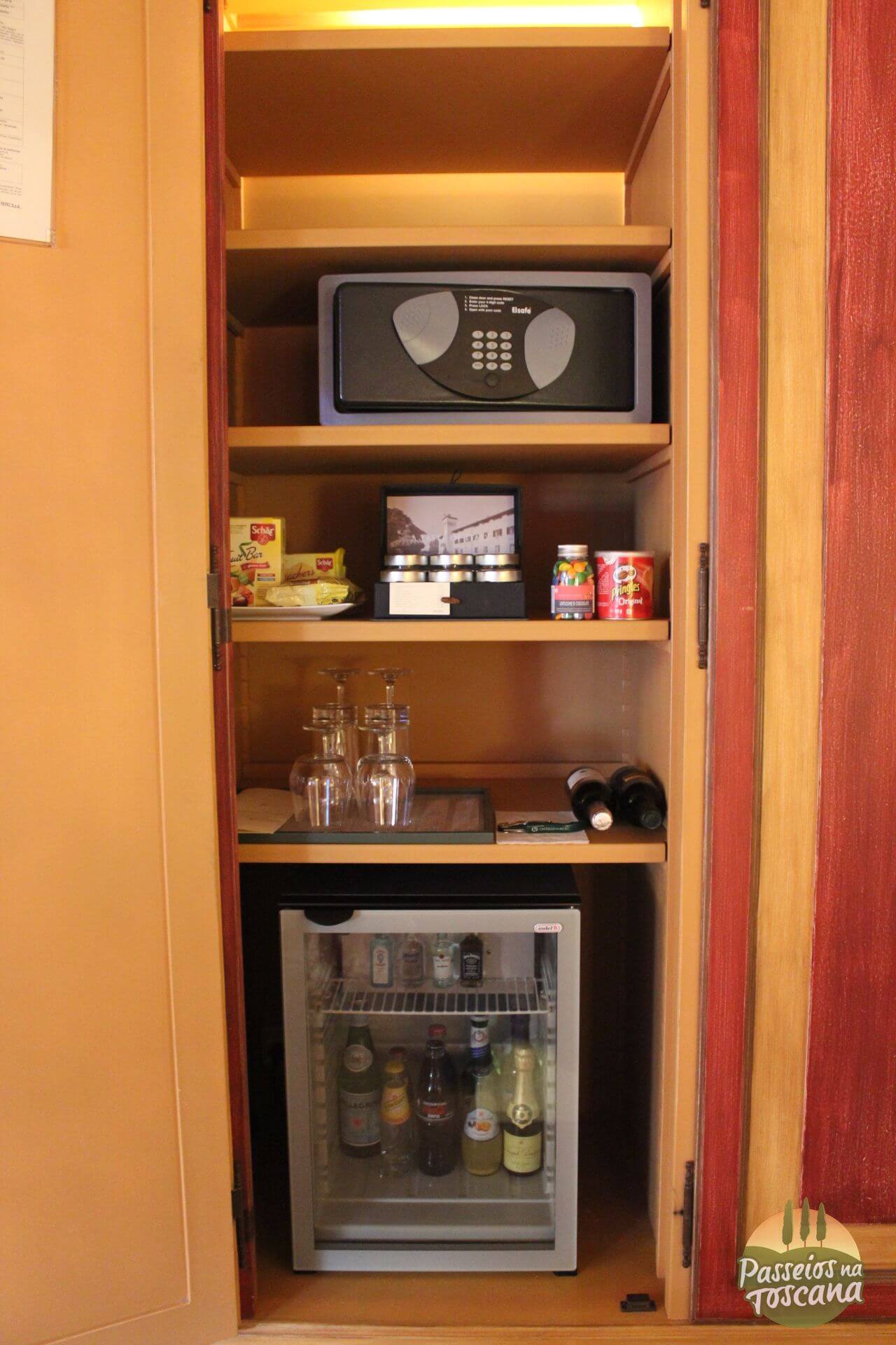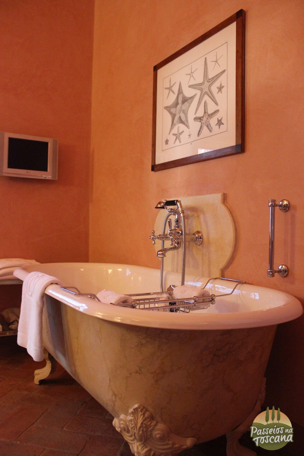Vamos por partes. O hotel tem uma Enoteca maravilhosa, com centenas de garrafas, onde o sommelier organiza degustações de vinhos que contam a história do Brunello di Montalcino, dos produtores de Chianti Classico ou dos famosos e prestigiados Super Toscanos, com tábua de frios e queijos combinados com vinhos. A lista de vinhos é citada pela Wine Spectator.