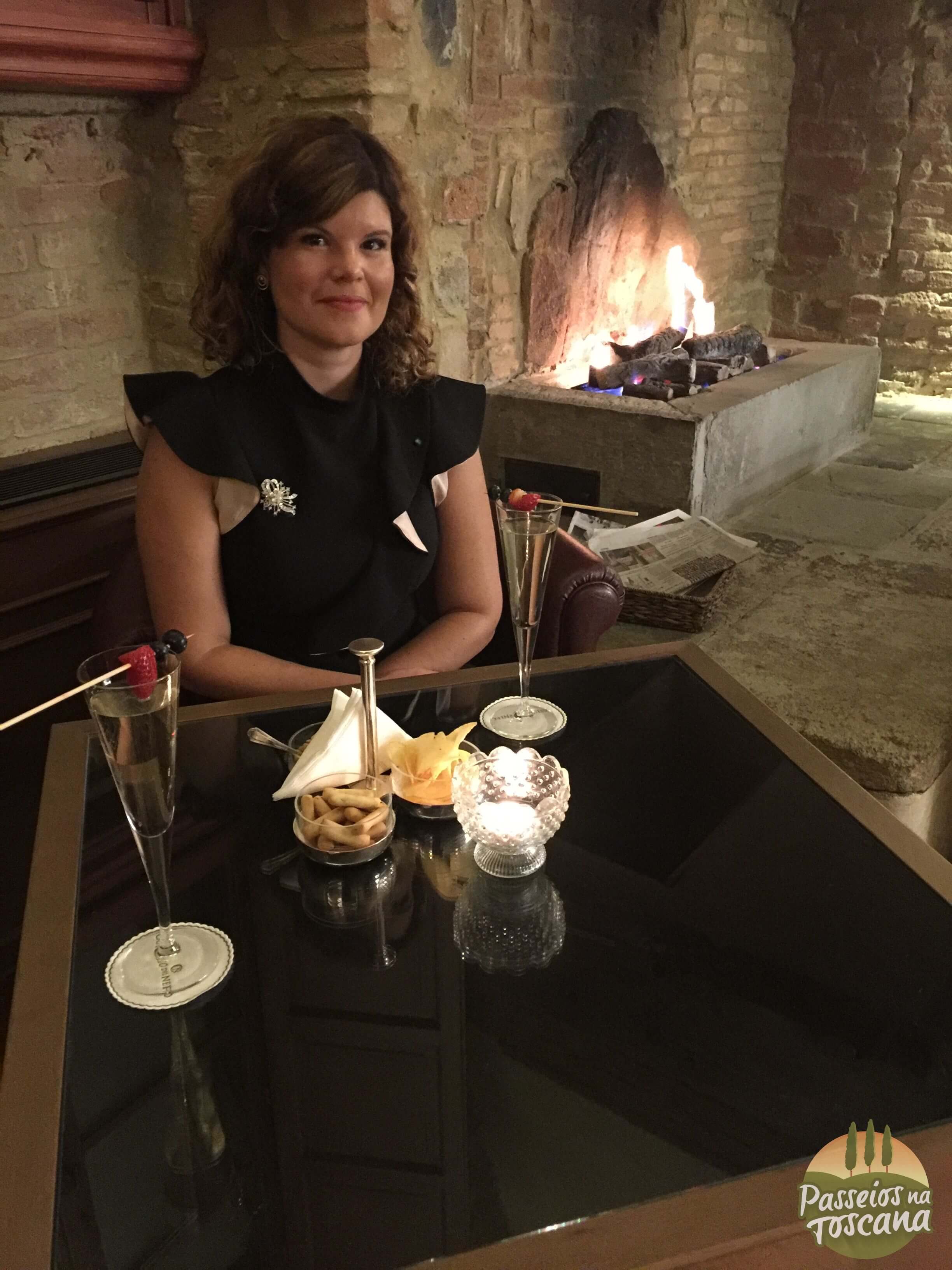 O The Bar é super charmoso, um ambiente interno do Castelo com uma lareira enorme. Eu aproveitei e fiz um aperitivo com espumante antes do jantar. No menu há vários drinks e vinhos.