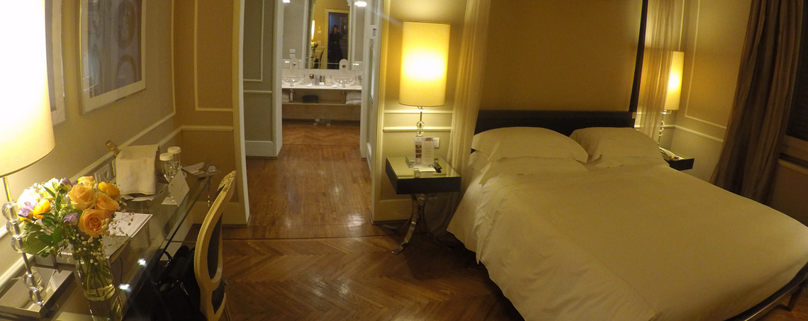 No quarto tinha maquina de café expresso e chá, além de um frigobar cheio de bebidas, opções de snacks e biscoitinhos toscanos. Fui recebida com uma garrafa prosseco geladinha, e flores no quarto. O quarto era enorme, com sala, quarto, closet, banheiro com opção dupla de chuveiro e banheira.