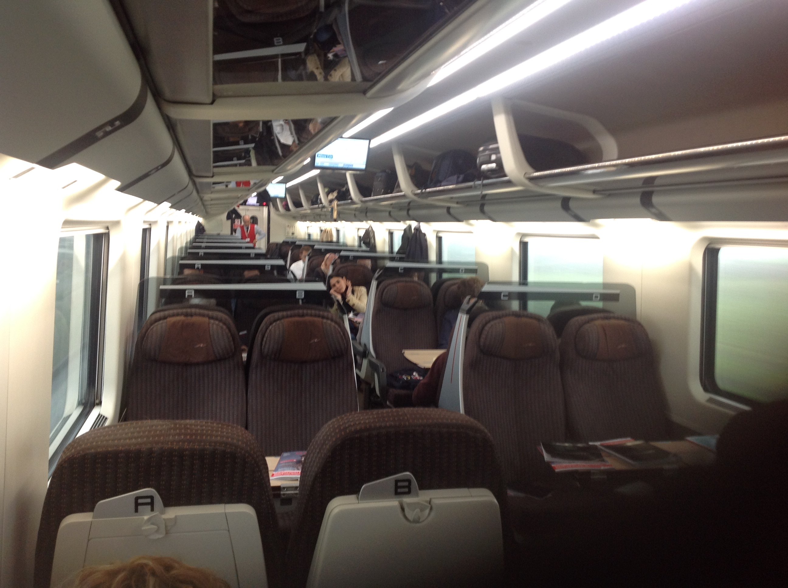 . Club: é sempre o primeiro vagão, facilitando pra quem esta na estação a entrada. A metade do vagão é cabinas privativas e a outra metade – cadeiras de couro reclináveis, fileiras 2-1 e snack e bebidas (alcoólicas ou não) de melhor qualidade, incluídas. Ha uma tela (como nos aviões) com tv e jogos.