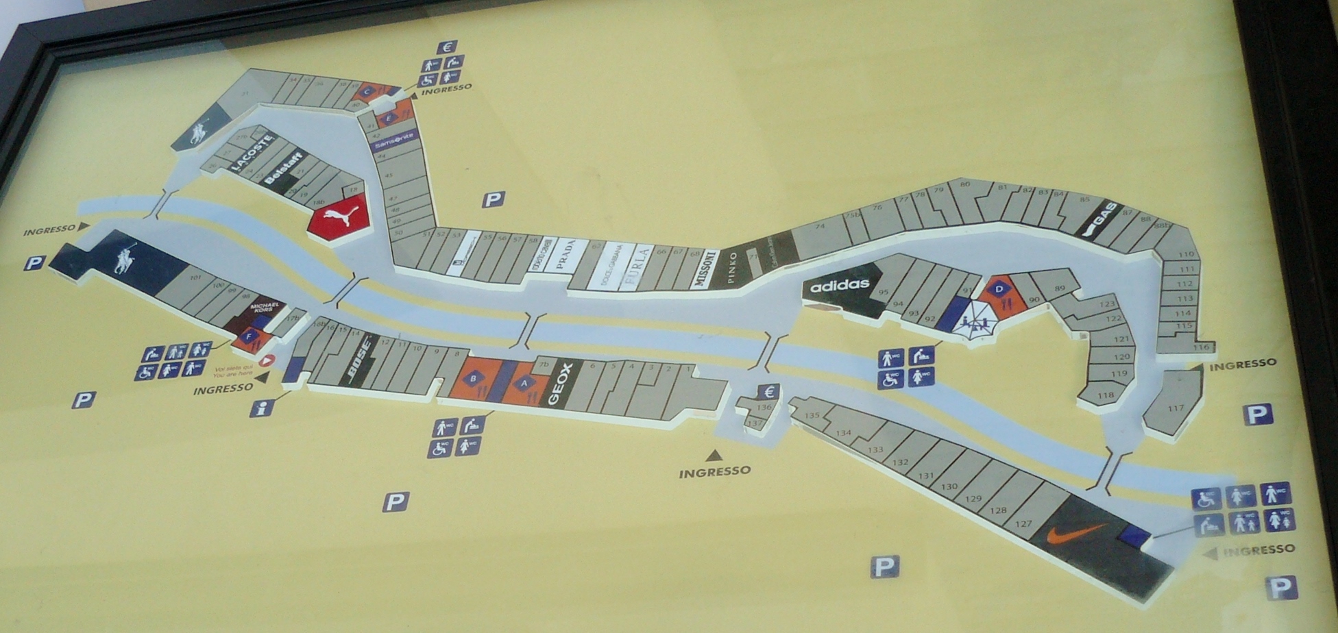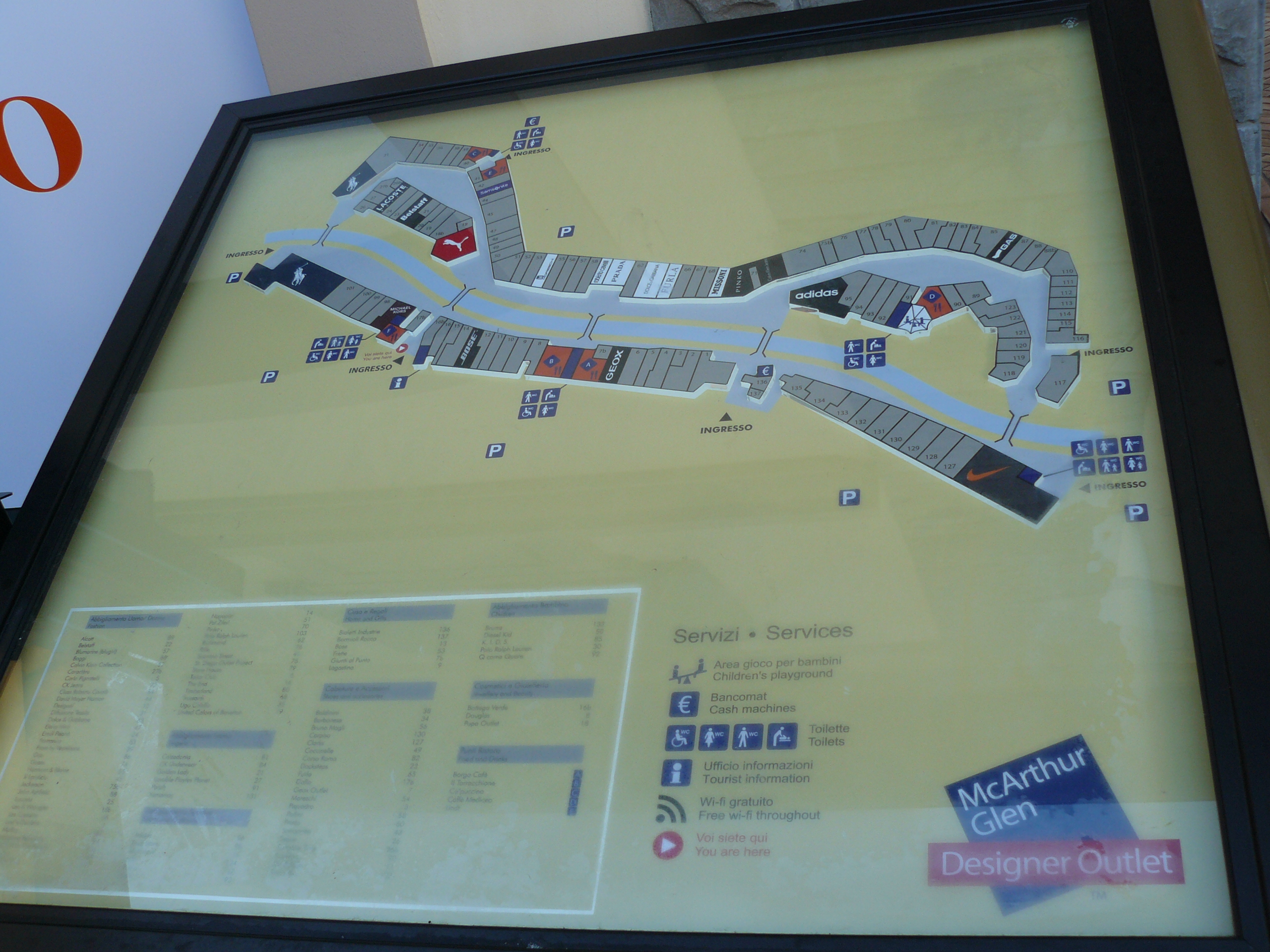 Possui marcas como Adidas, Puma, Calvin Klein, Prada, Benetton, Dolce & Gabbana, Guess, Brooksfield, Bottega Verde, Diesel, Roberto Cavalli, Ralph Lauren, Fornarina, Furla, Gas, Grigio Perla, Guru, La Casa Italiana, Levi’s-Dockers, Pollini, Puma, Pupa, Prada, Stefanel, Benetton, Lindt, Marlboro, Michael Kors, Desigual, Motivi, Pinko, Flavio Castellani, entre outras.