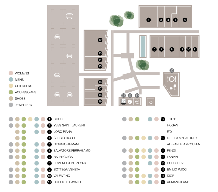 Uma galeria dos mais famosos e exclusivos designers do mundo como: Alexander McQueen, Armani Jeans, Balenciaga, Bottega Veneta, Burberry, Dior, Ermenegildo Zegna, Fay, Fendi, Giorgio Armani, Gucci, Hogan, Loro Piana, Marni, Pucci, Roberto Cavalli, Salvatore Ferragamo, Sergio Rossi, Stella McCartney, Tod’s, Valentino e Yves Saint Laurent.