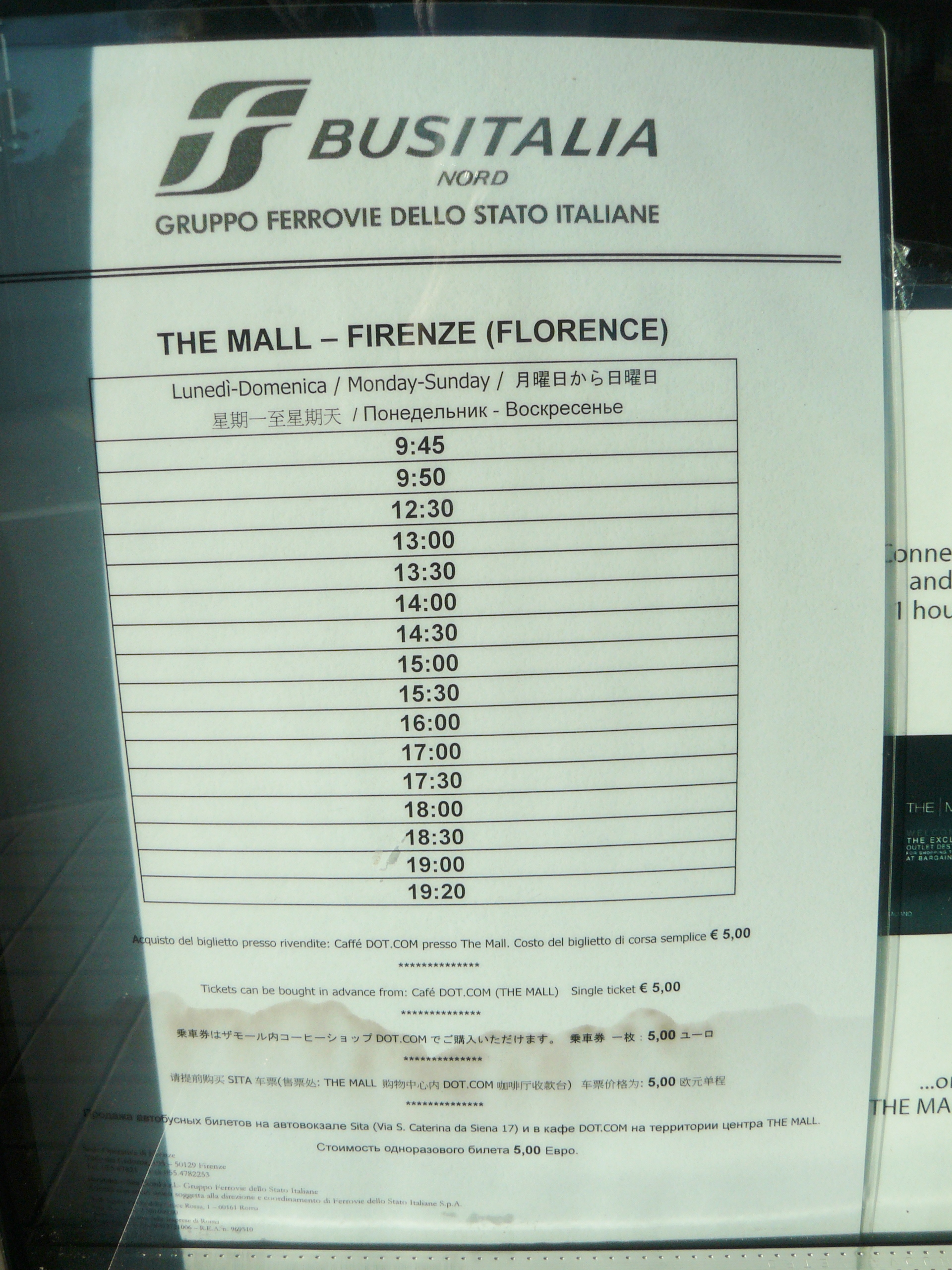 Serviço de Shuttle: Um serviço diário faz a ligação entre o centro de Florença e o Outlet The Mall e vice-versa. Os visitantes podem ser recolhidos nos hotéis (hotéis de luxo) próximos do centro. Para mais informações e marcações contactar o Centro de informações para o número T +39 055 8657775+39 055 8657775.