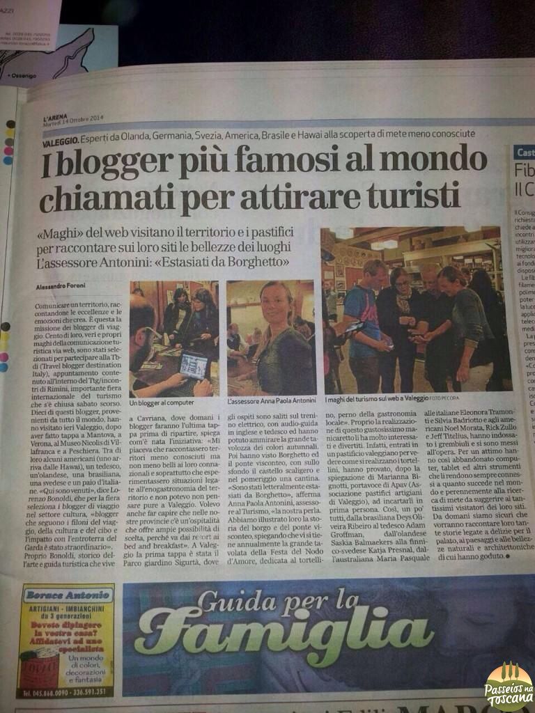 – Jornal Italiano: ARENA DE VERONA– 14.10.2014 – I Blogger píu famosi al mondo chiamati per stirare turisti – sobre a visita de alguns bloggers (entre os quais a autora deste blog) na cidade de Valeggio Sul Mincio durante o Blog Tour #VeronaGarda