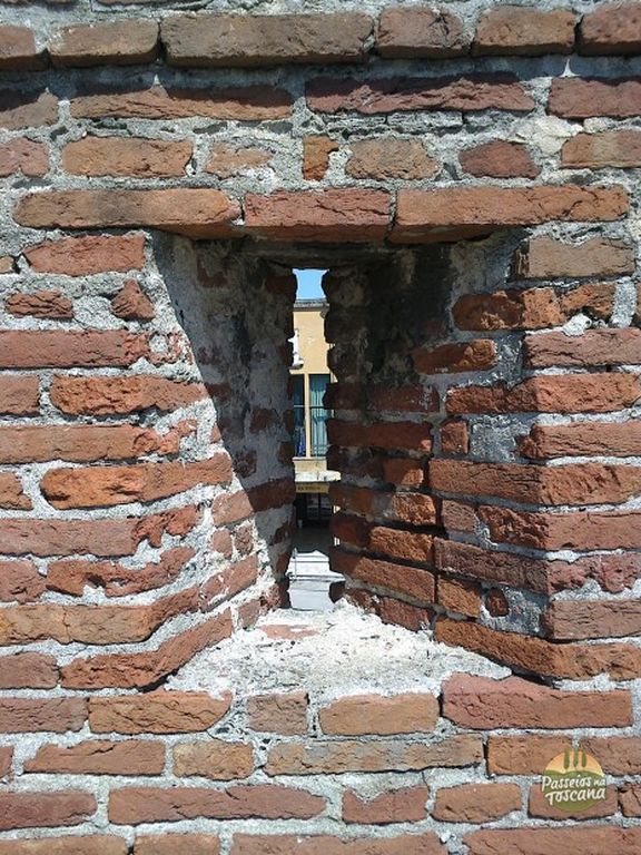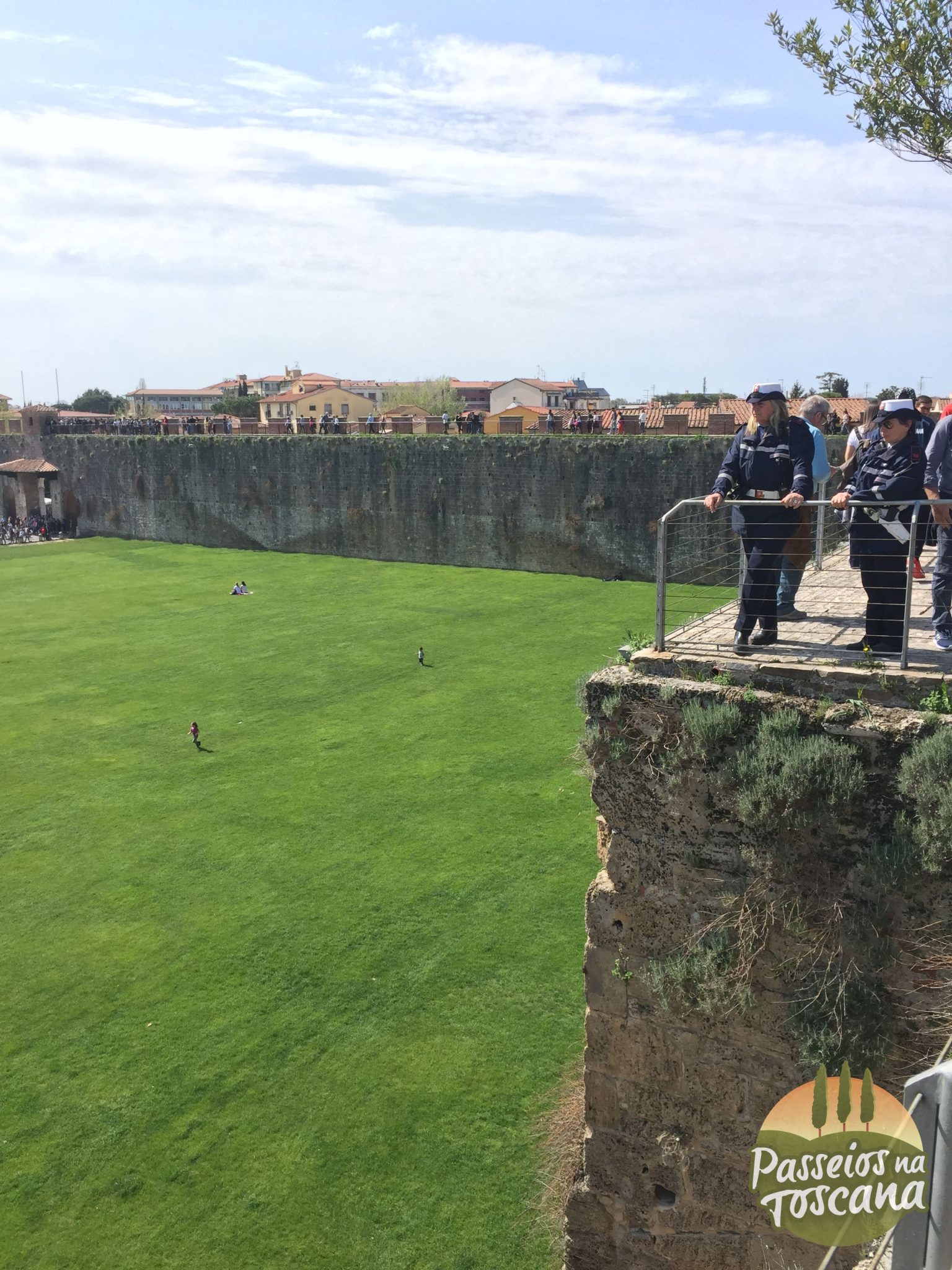 Em 2014, a muralha foi aberta em uma parte e eu pude conferir parte do caminhamento da muralha na Piazza dei Miracoli, com acesso a partir da torre de Santa Maria, até a Piazza dele Gondole.